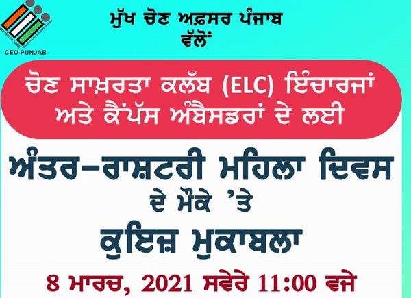 ਅੰਮ੍ਰਿਤਸਰ, 7 ਮਾਰਚ (ਸੁਖਬੀਰ ਸਿੰਘ) – ਮੁੱਖ ਚੋਣ ਅਫ਼ਸਰ ਪੰਜਾਬ ਦੀ ਹਦਾਇਤਾਂ ਅਨੁਸਾਰ ਚੋਣਾਂ ਅਤੇ ਰਾਜਨੀਤੀ ਵਿੱਚ ਮਹਿਲਾਵਾਂ ਦੀ ਭੂਮੀਕਾ ਦੇ ਵਿਸ਼ੇ ਸਬੰਧੀ ਚੋਣ ਸਾਖਰਤਾ ਕਲੱਬ ਅਤੇ ਕੈਂਪਸ ਐਂਬੈਸਡਰਾਂ ਲਈ 8 ਮਾਰਚ ਨੂੰ ਸਵੇਰੇ 11:00 ਵਜੇ ਆਨਲਾਈਨ ਕੁਇਜ਼ ਮੁਕਾਬਲਾ ਕਰਵਾਇਆ ਜਾ ਰਿਹਾ ਹੈ।