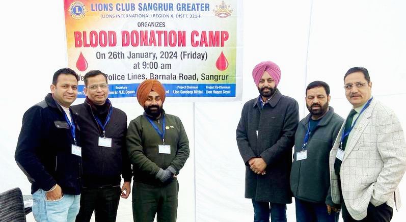 ਸੰਗਰੂਰ, 29 ਜਨਵਰੀ (ਜਗਸੀਰ ਲੌਂਗੋਵਾਲ) – ਲਾਇਨਜ਼ ਕਲੱਬ ਸੰਗਰੂਰ ਗ੍ਰੇਟਰ ਵਲੋਂ ਗਣਤੰਤਰ ਦਿਵਸ ਮੌਕੇ ਪੁਲਿਸ ਲਾਈਨ ਸਟੇਡੀਅਮ ਵਿਖੇ ਖੂਨਦਾਨ ਕੈਂਪ