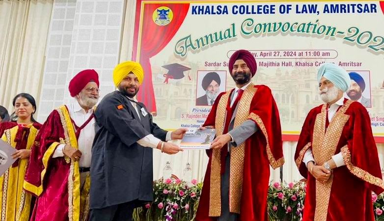 ਅੰਮ੍ਰਿਤਸਰ, 27 ਅਪ੍ਰੈਲ (ਸੁਖਬੀਰ ਸਿੰਘ ਖੁਰਮਣੀਆਂ) – ਖ਼ਾਲਸਾ ਕਾਲਜ ਆਫ ਲਾਅ ਵਲੋਂ ਅੱਜ ਕਰਵਾਈ ਗਈ ਪਹਿਲੀ ਕਨਵੋਕੇਸ਼ਨ ਵਿੱਚ ਕੈਬਨਿਟ ਮੰਤਰੀ