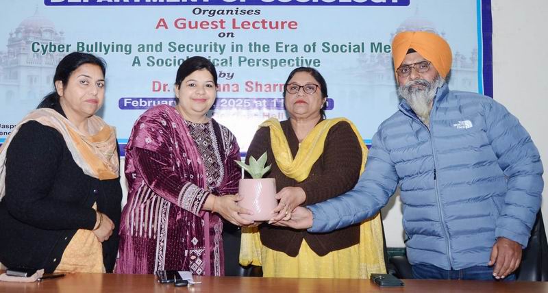 ਅੰਮ੍ਰਿਤਸਰ, 17 ਫਰਵਰੀ (ਸੁਖਬੀਰ ਸਿੰਘ ਖੁਰਮਣੀਆਂ) – ਖ਼ਾਲਸਾ ਕਾਲਜ ਦੇ ਸਮਾਜ ਵਿਗਿਆਨ ਵਿਭਾਗ ਵਲੋਂ ਸੋਸ਼ਲ ਮੀਡੀਆ ਦੇ ਦੌਰ ’ਚ ਸਾਈਬਰ ਧੱਕੇਸ਼ਾਹੀ ਅਤੇ ਇਸ ਦੀ ਸੁਰੱਖਿਆ ਦੇ ਸਮਾਜਿਕ ਪਰਿਪੇਖ ਨੂੰ ਉਘਾੜਨ ਲਈ ਵਿਸ਼ੇਸ਼ ਲੈਕਚਰ ਕਰਵਾਇਆ ਗਿਆ।ਕਾਲਜ ਦੇ ਕਾਰਜ਼ਕਾਰੀ ਪ੍ਰਿੰਸੀਪਲ ਡਾ: ਅਰਵਿੰਦਰ ਕੌਰ ਕਾਹਲੋਂ ਦੀ ਸਰਪ੍ਰਸਤੀ ਅਧੀਨ ਅਤੇ ਪ੍ਰੋ: ਜਸਪ੍ਰੀਤ ਕੌਰ ਡੀਨ ਹਿਊਮੈਨੀਟੀ ਦੀ ਅਗਵਾਈ ਹੇਠ ਆਯੋਜਿਤ ਇਸ ਮਹੱਤਵਪੂਰਨ ਵਿਸ਼ੇ ’ਤੇ ਗੱਲਬਾਤ ਕਰਨ ਲਈ ਡਾ: ਰਚਨਾ ਸ਼ਰਮਾ ਸਹਾਇਕ ਪ੍ਰੋਫੈਸਰ ਸਮਾਜ ਵਿਗਿਆਨ ਵਿਭਾਗ, ਗੁਰੂ ਨਾਨਕ ਦੇਵ ਯੂਨੀਵਰਸਿਟੀ ਪਹੁੰਚੇ ਸਨ।