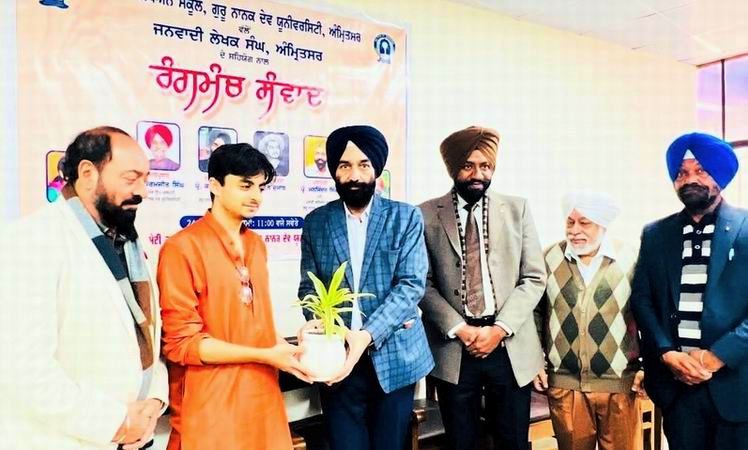 ਅੰਮ੍ਰਿਤਸਰ, 28 ਦਸੰਬਰ (ਦੀਪ ਦਵਿੰਦਰ ਸਿੰਘ) – ਉਪ-ਕੁਲਪਤੀ ਪ੍ਰੋ. (ਡਾ.) ਕਰਮਜੀਤ ਸਿੰਘ ਦੇ ਦਿਸ਼ਾ ਨਿਰਦੇਸ਼ਾਂ ਤਹਿਤ ਪੰਜਾਬੀ ਅਧਿਐਨ ਸਕੂਲ ਗੁਰੂ ਨਾਨਕ ਦੇਵ ਯੂਨੀਵਰਸਿਟੀ ਵਲੋਂ ਜਨਵਾਦੀ ਲੇਖਕ ਸੰਘ ਅੰਮ੍ਰਿਤਸਰ ਦੇ ਸਹਿਯੋਗ ਨਾਲ “ਰੰਗਮੰਚ ਸੰਵਾਦ” ਰਚਾਇਆ ਗਿਆ, ਜਿਸ ਵਿੱਚ ਕਨੇਡਾ ਤੋਂ ਵਿਸ਼ੇਸ਼ ਤੌਰ ‘ਤੇ ਸੰਵਾਦ ਰਚਾਉਣ ਲਈ ਰੰਗੰਮਚ ਦੇ ਖੋਜਾਰਥੀ ਅਤੇ ਡਾਏਰੈਕਟਰ ਅਜ਼ਲ ਦੁਸਾਂਝ ਨੇ ਸ਼ਮੂਲੀਅਤ ਕੀਤੀ।ਮੁੱਖ ਮਹਿਮਾਨ ਵਜੋਂ ਰਜਿਸਟਰਾਰ ਪ੍ਰੋ. ਕਰਮਜੀਤ ਸਿੰਘ ਚਾਹਲ ਅਤੇ ਵਿਸ਼ੇਸ਼ ਮਹਿਮਾਨ ਸ਼੍ਰੋਮਣੀ ਨਾਟਕਕਾਰ ਕੇਵਲ ਧਾਲੀਵਾਲ ਅਤੇ ਨਾਟਕਕਾਰ ਜਗਦੀਸ਼ ਸਚਦੇਵਾ ਨੇ ਸ਼ਿਰਕਤ ਕੀਤੀ ਜਦੋਂ ਕਿ ਸਮਾਗਮ ਦੀ ਪ੍ਰਧਾਨਗੀ ਪ੍ਰੋ. ਮਨਜਿੰਦਰ ਸਿੰਘ ਮੁਖੀ ਪੰਜਾਬੀ ਅਧਿਐਨ ਸਕੂਲ, ਗੁਰੂ ਨਾਨਕ ਦੇਵ ਯੂਨੀਵਰਸਿਟੀ ਹੁਰਾਂ ਕੀਤੀ।ਪ੍ਰੋ. ਡਾ. ਮਨਜਿੰਦਰ ਸਿੰਘ ਨੇ ਆਏ ਹੋਏ ਮਹਿਮਾਨਾਂ ਦਾ ਰਸਮੀ ਸੁਆਗਤ ਕਰਦਿਆਂ ਕਿਹਾ ਕਿ ਰੰਗਮੰਚ ਆਪਣੇ-ਆਪ ਵਿੱਚ ਇਕ ਸੰਪੂਰਨ ਕਲਾ ਹੈ, ਕਿਉਂਕਿ ਇਹ ਇੱਕੋਂ ਸਮੇ ਕਾਵਿ, ਸੰਗੀਤ, ਅਦਾਕਾਰੀ ਅਤੇ ਸਜ਼ਿੰਦ ਪੇਸ਼ਕਾਰੀ ਦਾ ਸੁਮੇਲ ਹੁੰਦੀ ਹੈ।ਯੂਨੀਵਰਸਿਟੀ ਦੇ ਰਜਿਸਟਰਾਰ ਪ੍ਰੋ. ਚਾਹਲ ਨੇ ਪੰਜਾਬੀ ਵਿਭਾਗ ਦੁਆਰਾ ਲਗਾਤਾਰ ਕਰਵਾਏ ਜਾਂਦੇ ਸੈਮੀਨਾਰਾਂ/ਕਾਨਫ਼ਰੰਸਾਂ/ਰੂ-ਬ-ਰੂ ਪ੍ਰੋਗਰਾਮਾਂ ਦੀ ਸ਼ਲਾਘਾ ਕੀਤੀ।